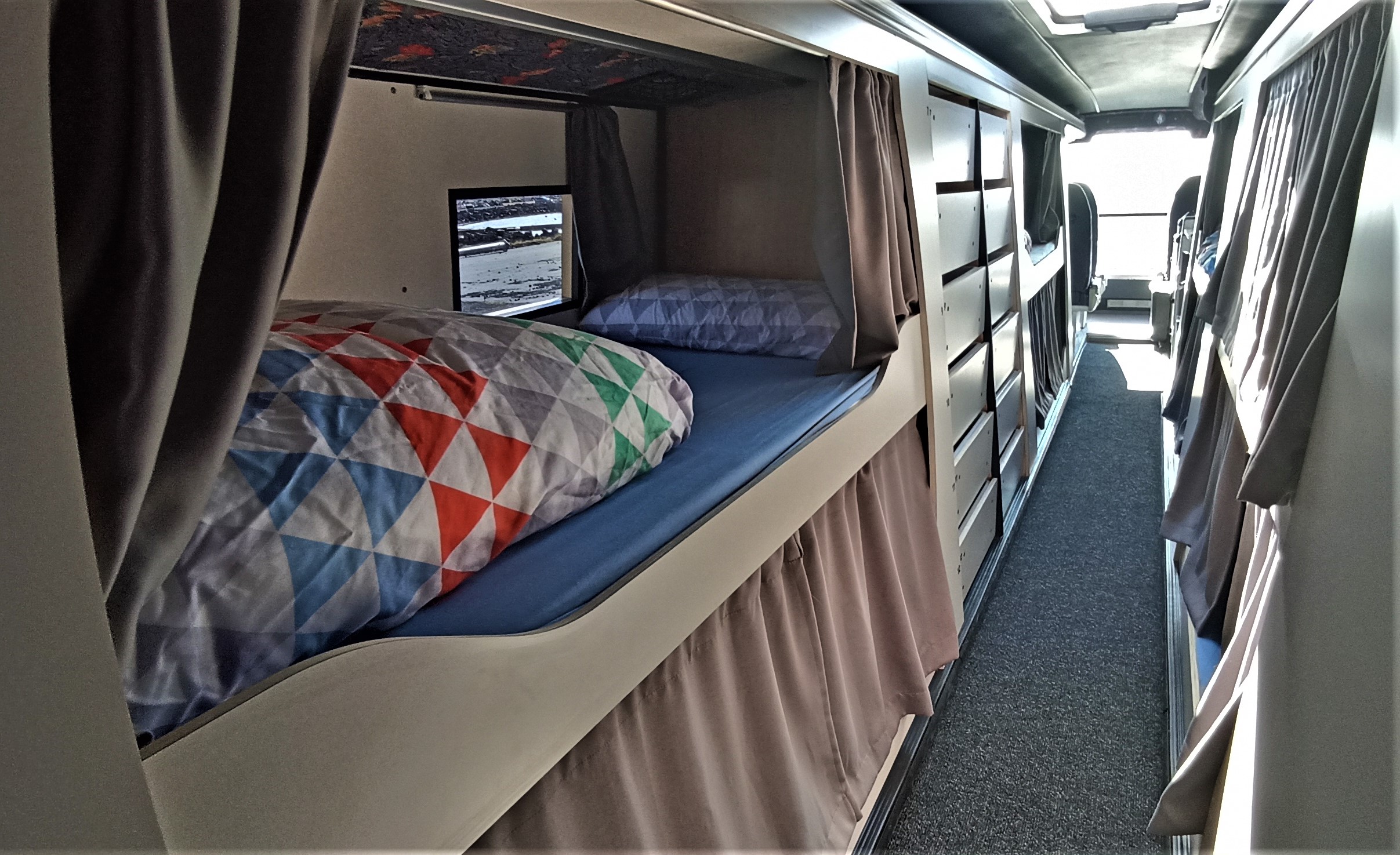 ✔ 7 noches de alojamiento a bordo del bus-hotel rodante con cama individual en litera dentro de